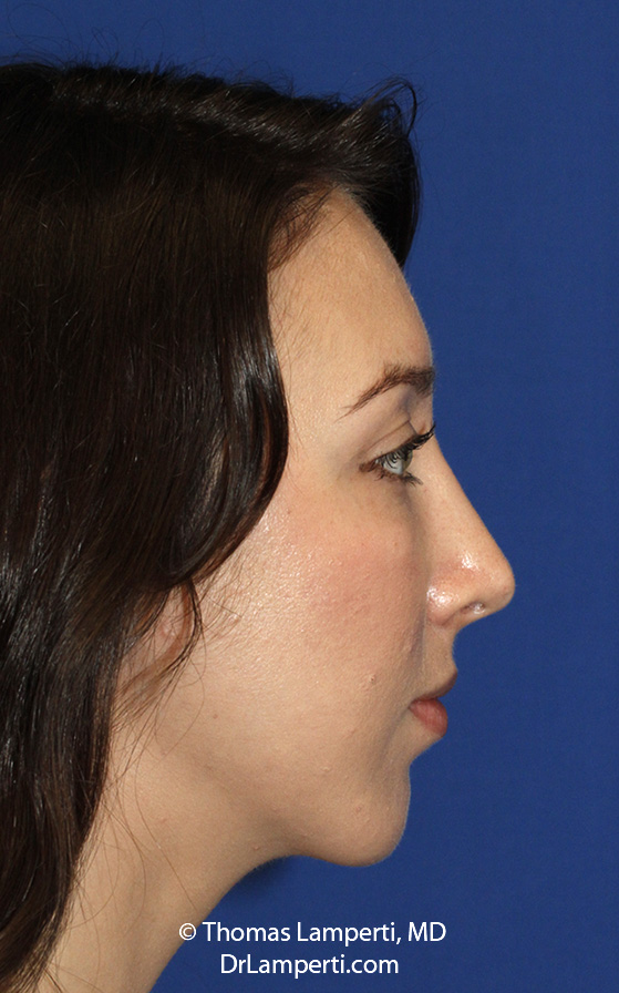 This patient traveled from Eastern Washington to consult with Thomas Lamperti, MD regarding improving her under-projected chin and chronic nasal obstruction, sinusitis and bridge hump. Dr. Lamperti addressed her chin projection by placing a extended anatomic style solid silicone implant using a small (submental) incision placed under the patient's chin. In the 1 year after photos you can see how this helped to provide better overall balance to the patient's facial proportions as her overall profile now has a straighter appearance compared with her former convex appearance. You can learn more about this patient's nose and sinus surgery here.