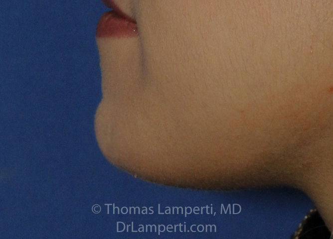 This woman came to Thomas Lamperti, MD to find out her options to make her face and chin less long. She wasn't concerned with the projection of her chin itself, but was bothered by how long her face appeared due to her long chin. Dr. Lamperti recommended a jaw reduction technique in which a segment of chin bone was removed and then the remaining chin re-secured back to the jaw using titanium plate. In the 15 month after photos you can see how the patient's chin is much shorter and more feminine appearing.