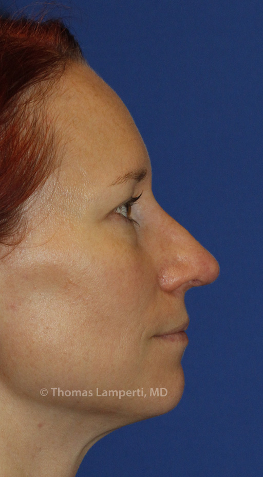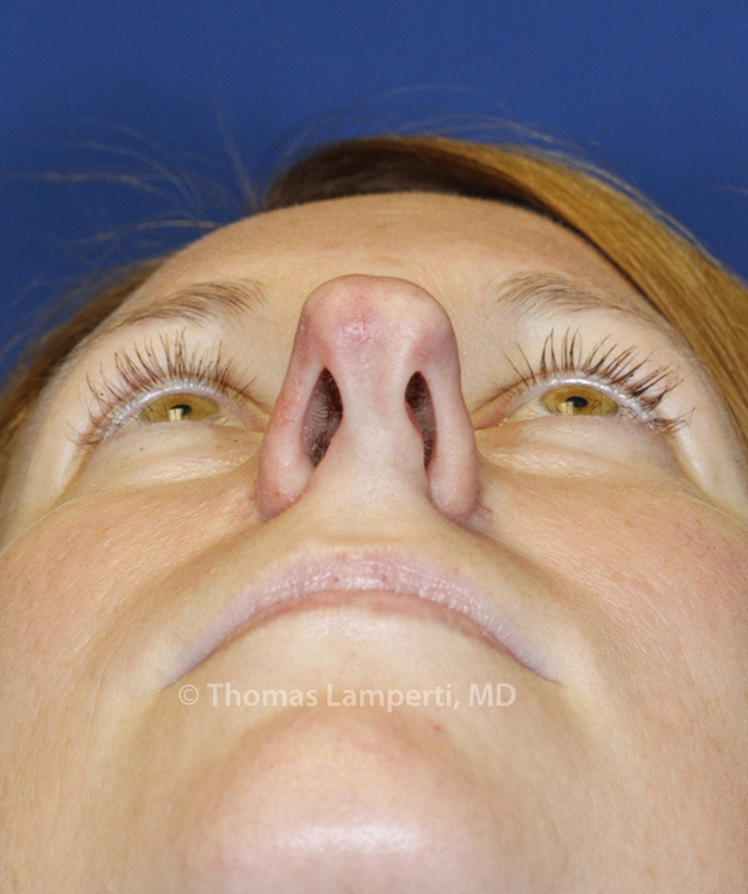 This Everett area rhinoplasty patient visited with Thomas Lamperti, MD to see if she could make her nose smaller, including treating the cleft between her tip cartilages. Dr. Lamperti also noted a crooked septum, deviated columella (seen on base view) and over-projected tip. Using an open septorhinoplasty approach Dr. Lamperti reduced the tip boxiness and narrowed the tip while also deprojected the tip and refining the bridge profile line. You can also see that the columella is now straighter creating more symmetric nostrils.