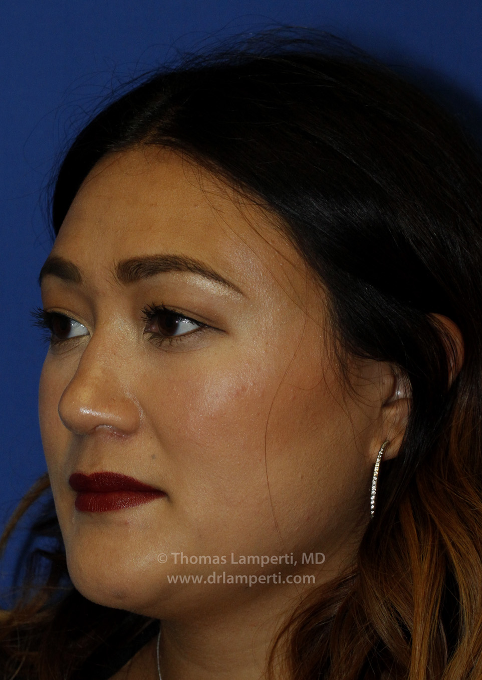 This Korean-American rhinoplasty patient came to Dr. Lamperti looking to refine her rounded, flattened nasal tip along with narrowing her nostril width and smoothing the bump on her bridge. Dr. Lamperti noted that the patient had relatively thick nasal tip skin along with an underprojected tip which created additional tip fullness. Dr. Lamperti performed an open septo-rhinoplasty procedure to made the desired changes to the patient's nose. He first straightened the patient's crooked nasal septum. He then used some of the patient's septal cartilage to form an extended columellar strut which allow Dr. Lamperti to reposition the patient's nasal tip in a more projected position. Dr. Lamperti also thinned the patient's thick nasal tip skin by using a defatting technique. To smooth the patient's bridge bump Dr. Lamperti used a rasp to remove some excess bone. Lastly, Dr. Lamperti used a Y to V alar base reduction technique to conservatively narrow the patient's wide nostrils. In the 20 month postoperative photos you can see how the patient's tip has much better definition along with having a smoother bridge. The patient would be expected to have further external nasal swelling reduction as her nose continues to heal.