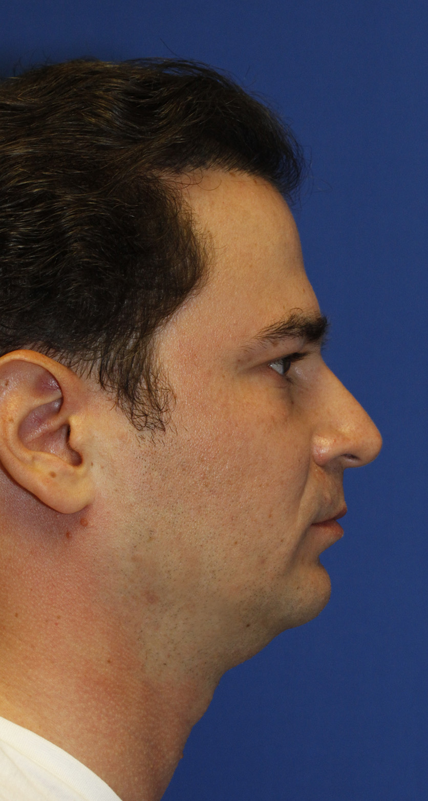 This Seattle rhinoplasty patient noted many years of chronic nasal obstruction and snoring. During his office exam Dr. Lamperti noted that the patient had a deviated nasal septum along with internal and external valve nasal stenosis which were all restricting the patient's nasal airflow. To correct these problems a functional septorhinoplasty was performed to straighten the patient's septum. Additionally, spreader grafts were placed to treat the patient's collapse middle bridge area (internal nasal valve) and lower lateral crural strut grafts were placed to rebuild the patient's pinched nostril region (external nasal valves). Sliding genioplasty, neck liposuction and corset platysmaplasty were done during the same surgery to address the patient's other treatment goals. In the 1 year after photos you can see how the patient has mantained a natural appearing nose that no longer has the same pinching and cartilage collapse. His neck and jawline are also much more proportional and masculine. Thanks to his improved airway, the patient has reports much improved snoring as well.