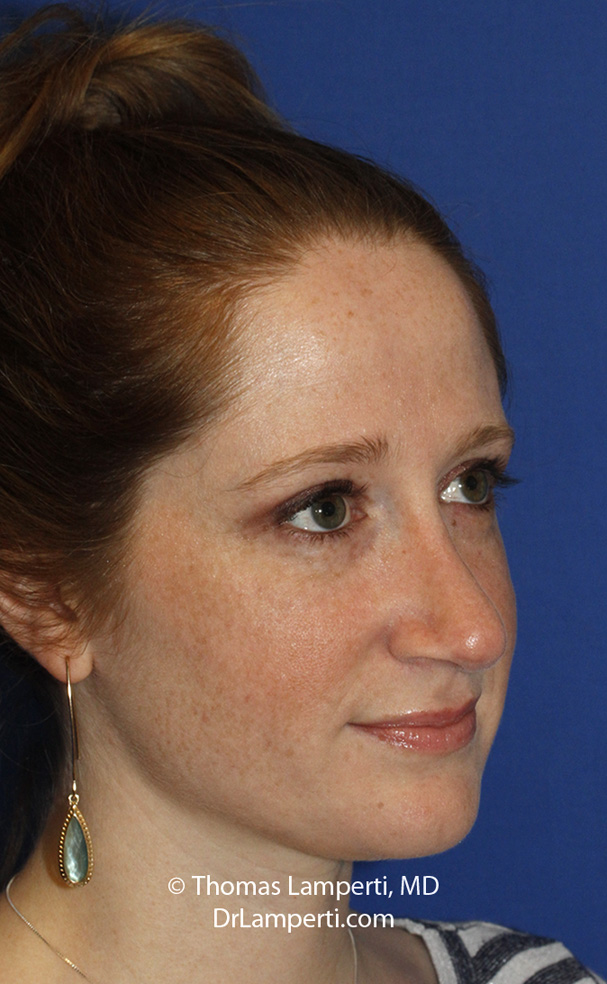 This rhinoplasty patient wanted to make relatively subtle changes to her nose including smoothing her bridge, lifting her prominent hanging columella and making it straighter on frontal view. Dr. Lamperti performed an open septorhinoplasty to acheive these goals. He smoothed the patient's bridge bump to create a straighter profile line and elevated her columella so it didn't hang down as much. In the 13 month after photos you can see how the patient has a natural improvement to her nose which is straighter on front view. Her tip is also less full and the columella tucked up as planned.